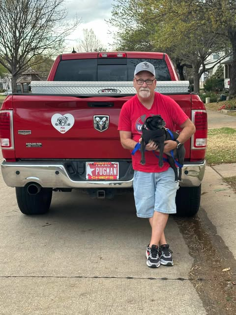 Piper and I moved to Texas a little over a year and a half ago. She was 12 and not in very good health. Her eyesight was failing, and she had cancer all over her body. I could not be selfish and had to say goodbye. I was not ready to adopt another pug just yet but began looking when I discovered DFW Pug Rescue. Retired and needing something to do, I started transporting pugs. I picked up this black pug named Faith. I had to keep her overnight and it was love at first sight again. She laid down beside me, stared up at me with her big brown eyes and I became a transport failure. Lady Di was a nickname I had for my wife, so renaming Faith Lady Di was a no brainer. Thank you, DFW Pug Rescue, for my constant companion.