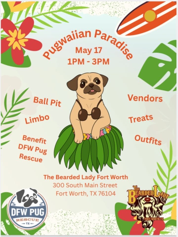 The Bearded Lady will be hosting DFW Pug Rescue for a pug Hawaiian Luau! Please come dressed in your best Hawaiian party outfit. Activities will include: Hawaiian themed vendors, drinks, snacks, Limbo contest, pup cooling paw pools, ball pit, best dressed pup/human contest, and more. Come on out for the pawty!