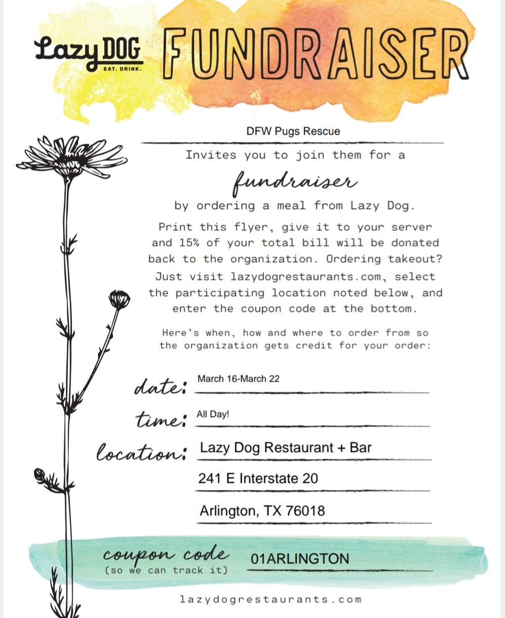 Come out to Lazy Dog Restaurant in Arlington any day March 16-22 and show them this flyer. Enjoy a great meal and drinks and the Restaurant will donate 15% of your bill to DFW Pug Rescue. Please share this to all your friends and family.