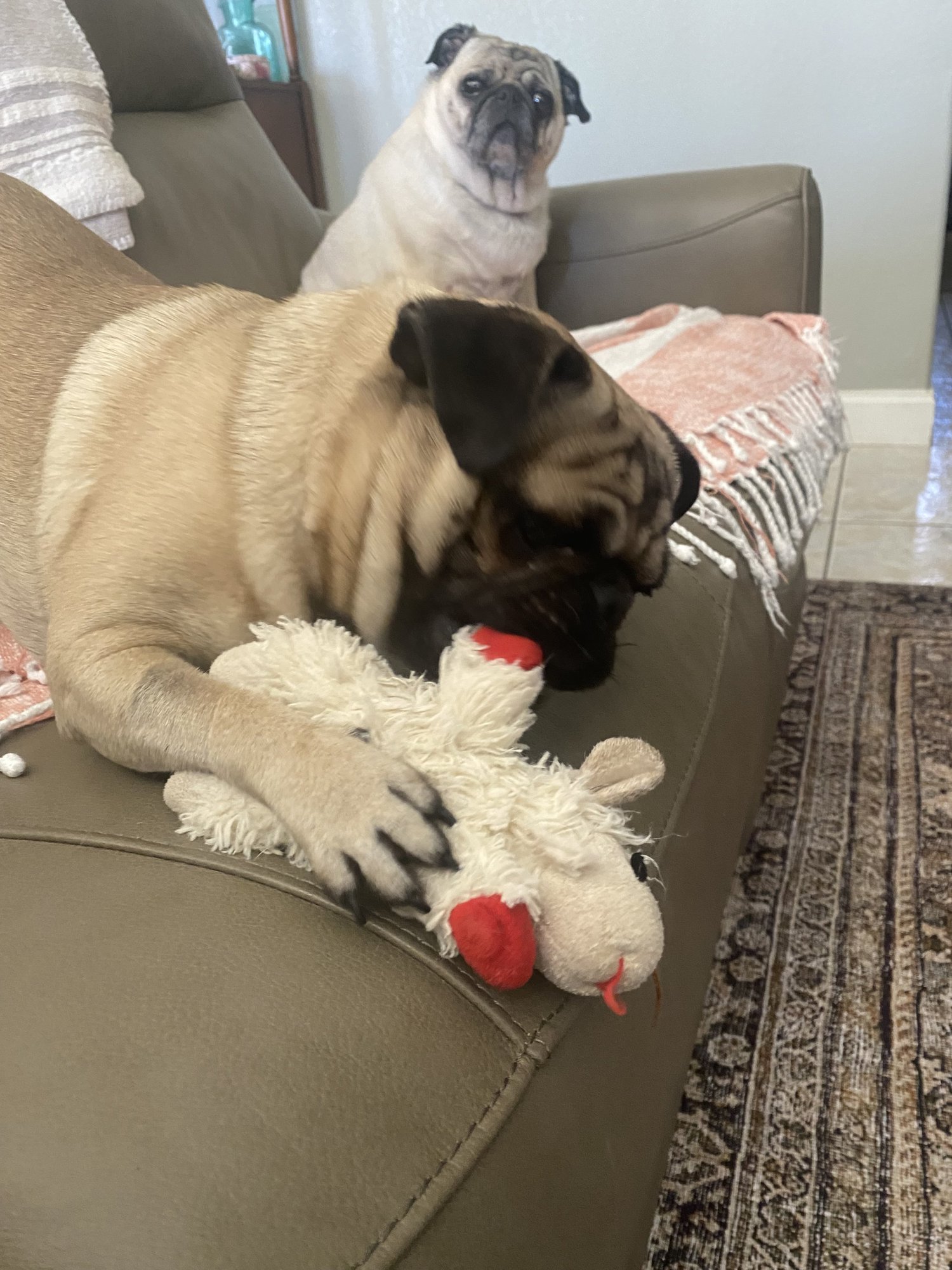 3.5-year-old Neo is a laid-back, fawn male pug with world-class Velcro skills and a gentle, affectionate temperament. A little heartbeat at your feet, he’ll stick by your side, whether you’re typing away at the computer or binge-watching your favorite show. His favorite pastimes include snuggling in bed with his people, going on walks, and occasionally picking a favorite stuffed, squeaker-less toy to proudly carry around. Neo is working on house training and wears a belly band indoors so he can’t leave his “autograph” around the house. He’s eager to please, walks politely on a leash, has excellent mealtime manners, and dines well alongside other dogs. Neo truly thrives with canine companionship and would be happiest in a home with another friendly dog and people who are home often. If you’re looking for a devoted shadow who promises lifelong loyalty (and bedtime cuddles), Neo may be your perfect match.