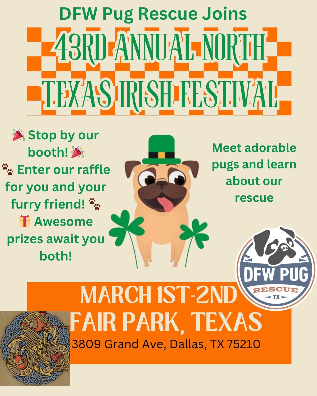 We will have a booth at North Texas Irish Festival at the Fair Park in Dallas. Come say hello to adorable pugs, learn more about the rescue, and enter our raffle for a basket from Chewy.
